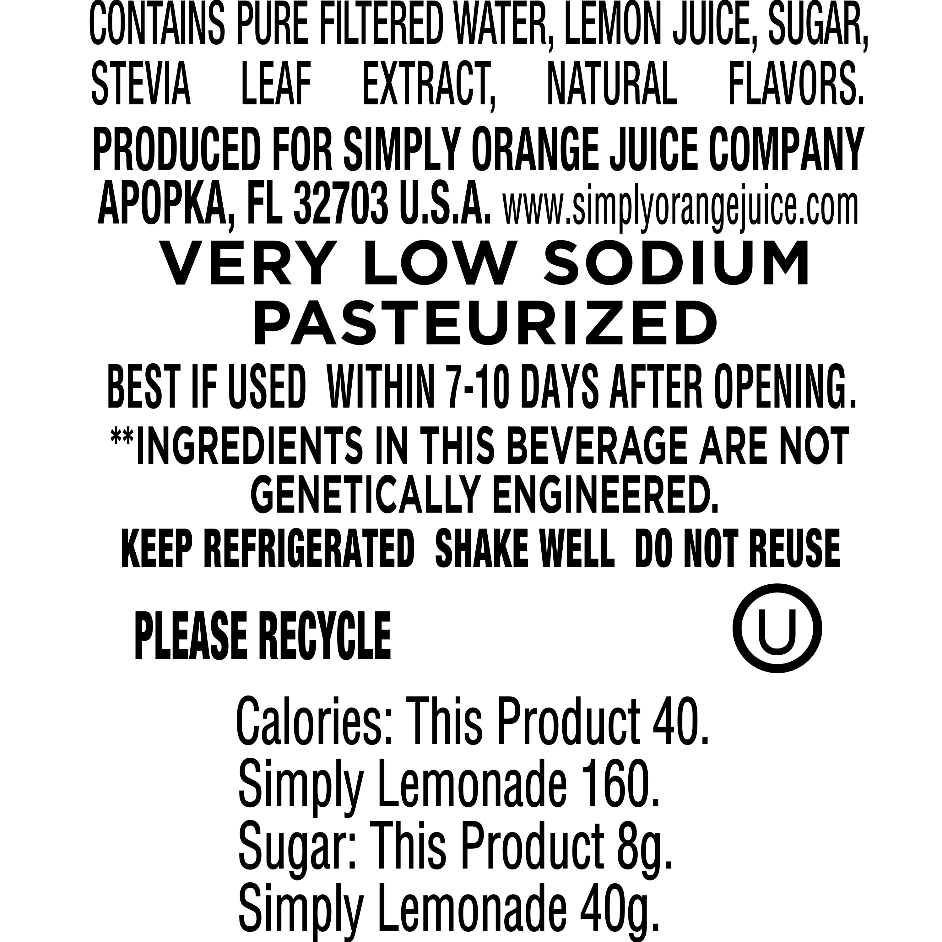Simply Light Lemonade - Shop Juice at H-E-B Nutrition Facts. Light Lemonade. about 7 Serving Per Container. Serving Size: 8.00 fl oz(240ml) Amount Per Serving. Calories: 25 % Daily Value* Total Fat 0g: 0% Sodium 15mg ... Simply Light Pulp Free Orange Juice with Calcium & Vitamin D, 52 oz. $4.10 each ($0.08/oz)