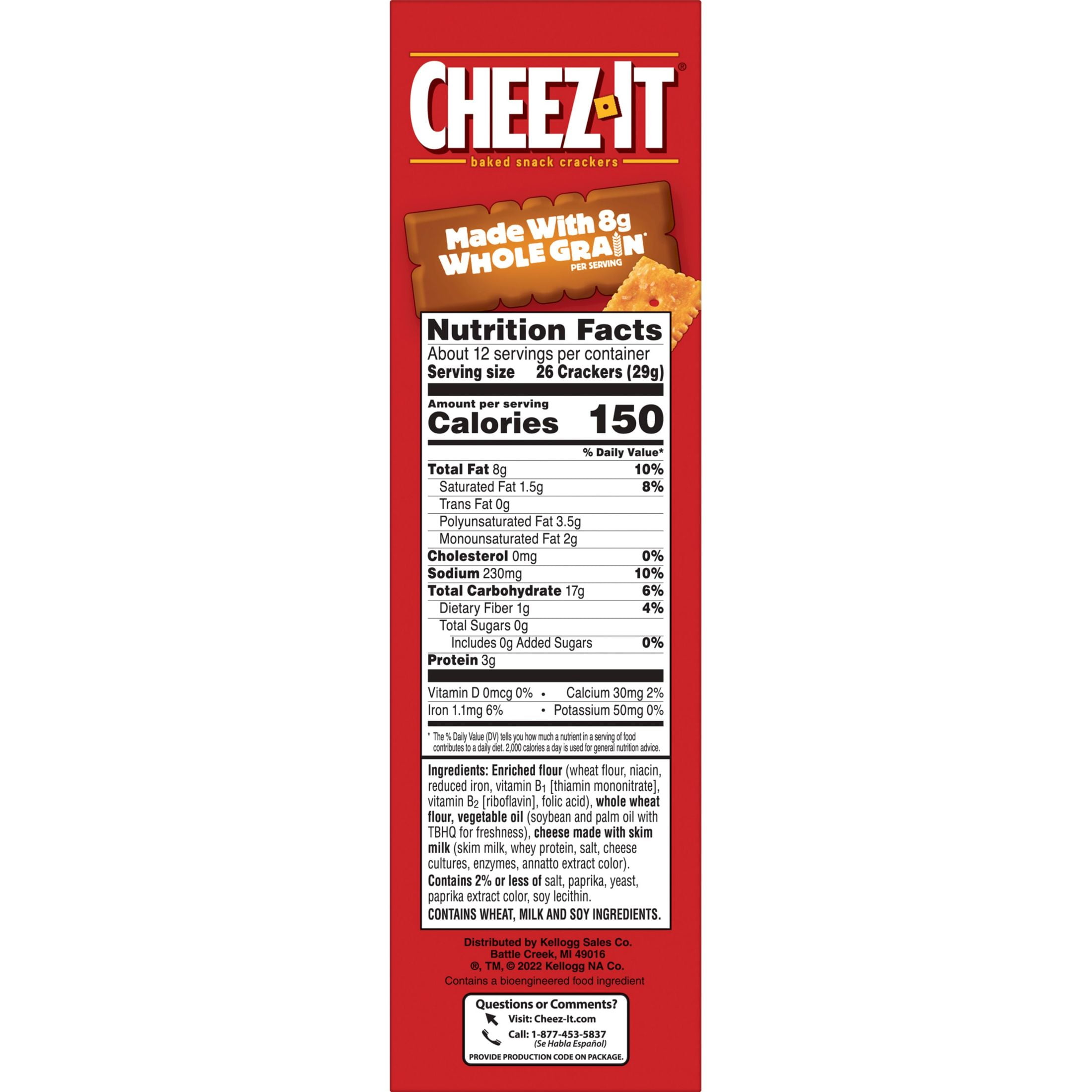Cheez-It® Whole Grain Snack Crackers - SmartLabel™ Cheez-It® Whole Grain Snack Crackers 00024100789436 Nutrition Ingredients Allergens Features & Benefits Company, Brand & Sustainability 150 Calories 1.5 g Sat Fat 230 mg Sodium 0 g Sugar Nutrition Facts Servings Per Container About 12 Serving Size 26 Crackers (29 g)